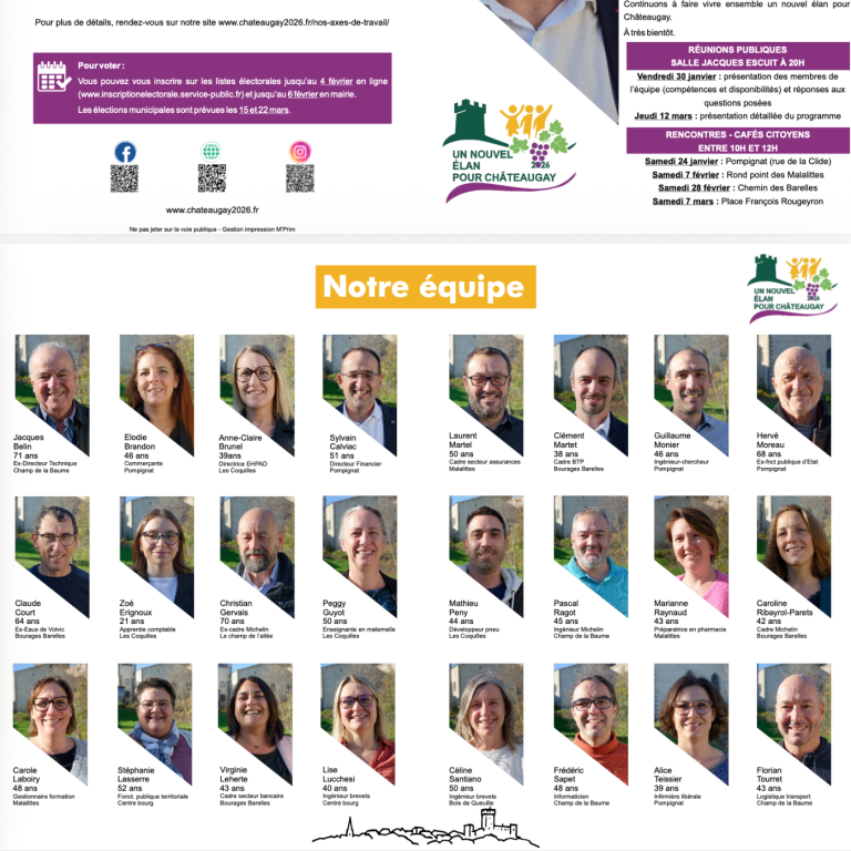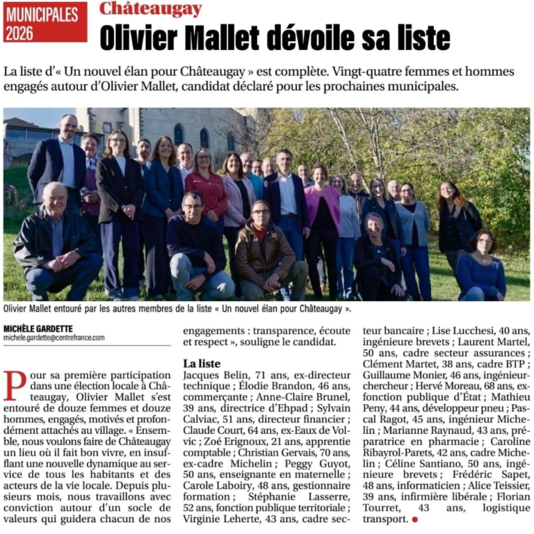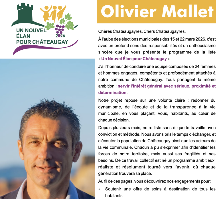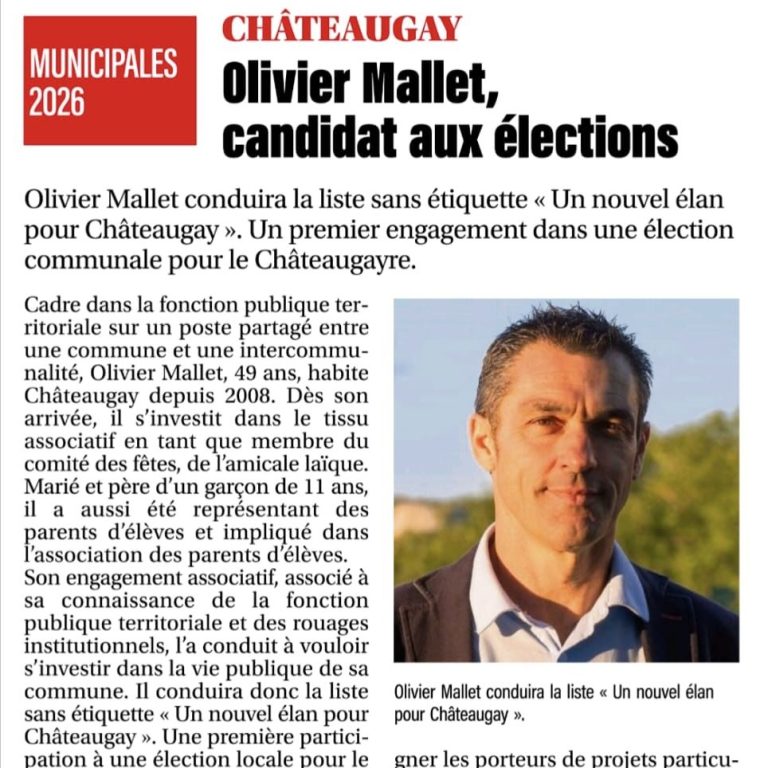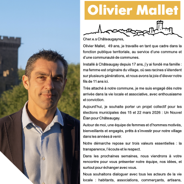 Découvrez la candidature d'Olivier Mallet et sa liste "un nouvel élan pour Châteaugay" pour les élections municipales de 2026.