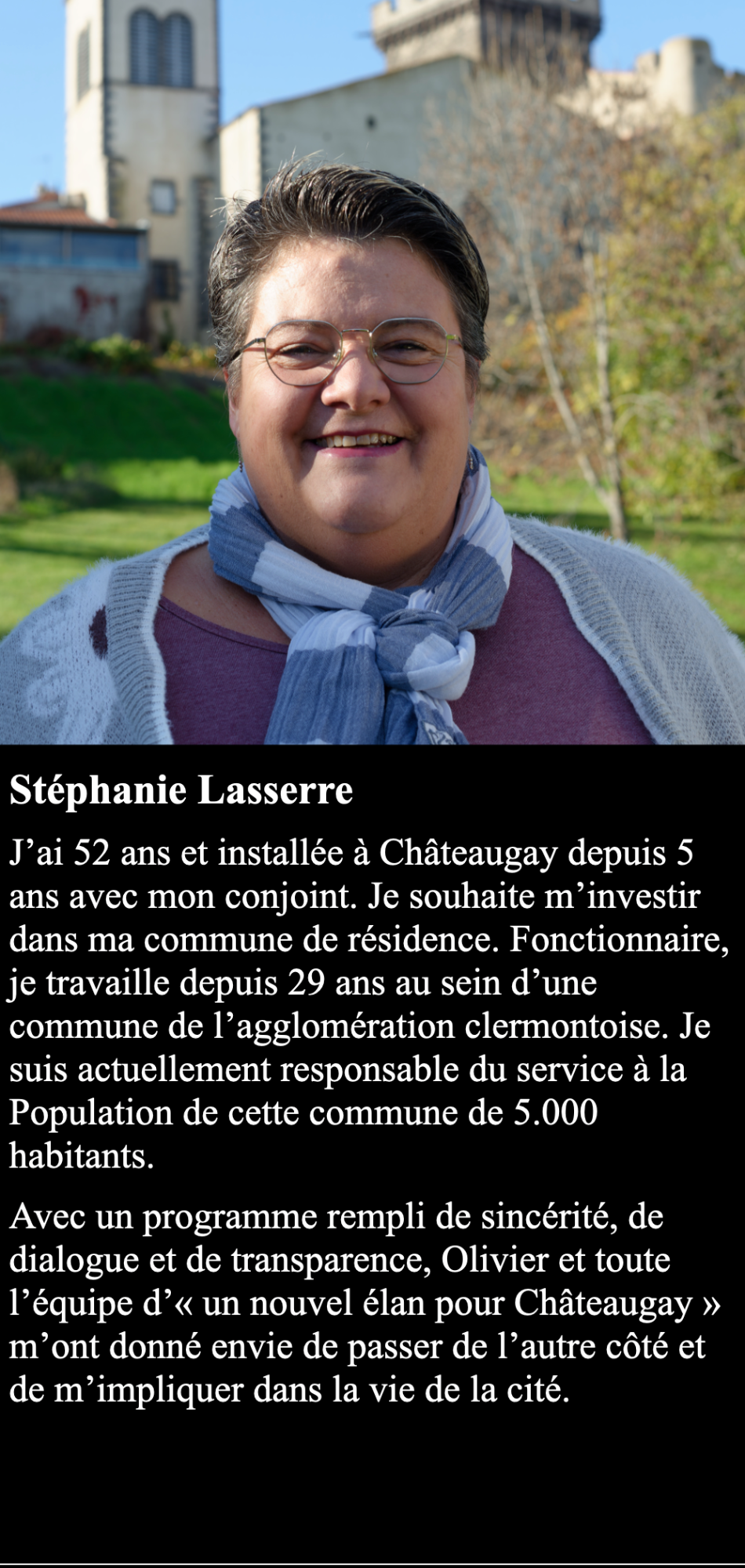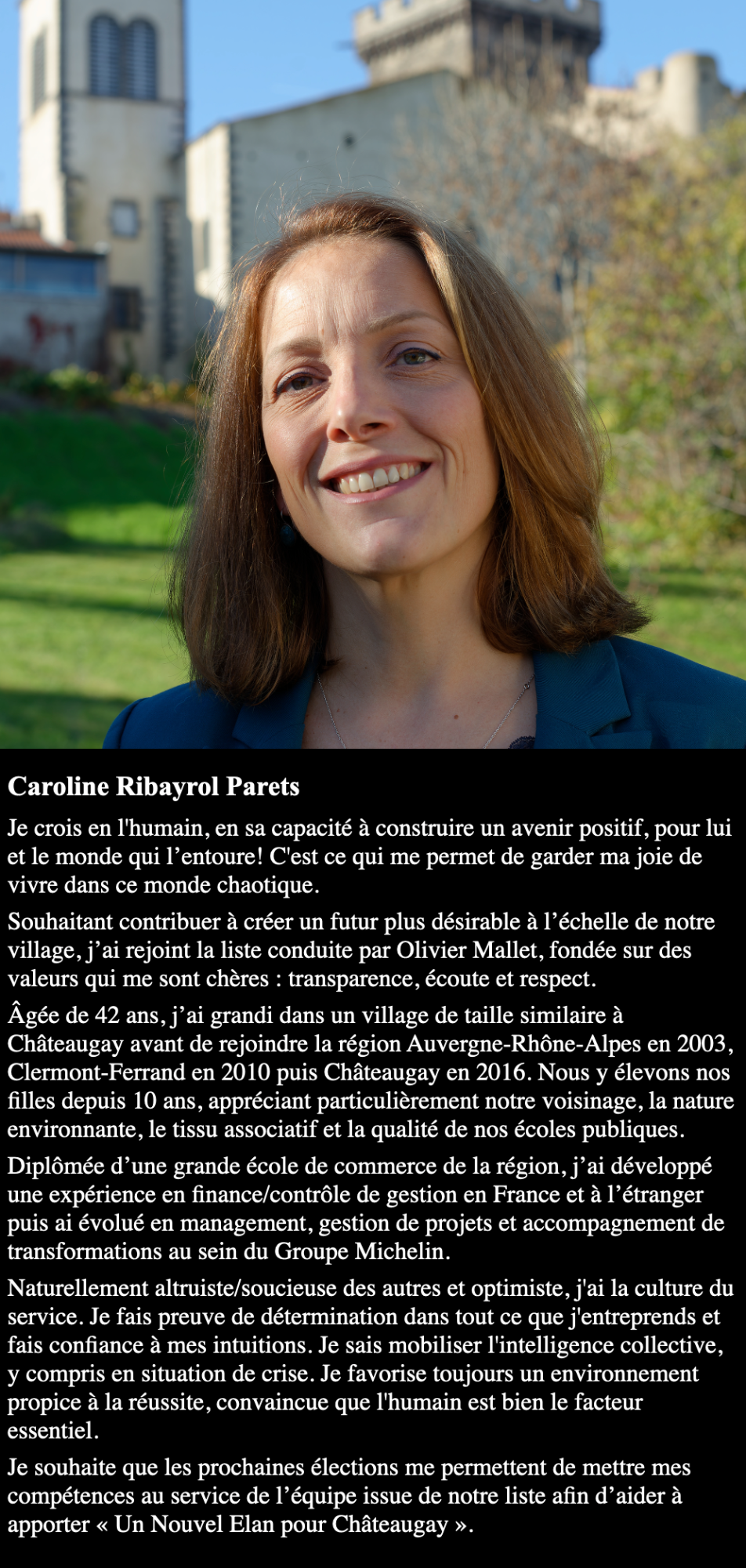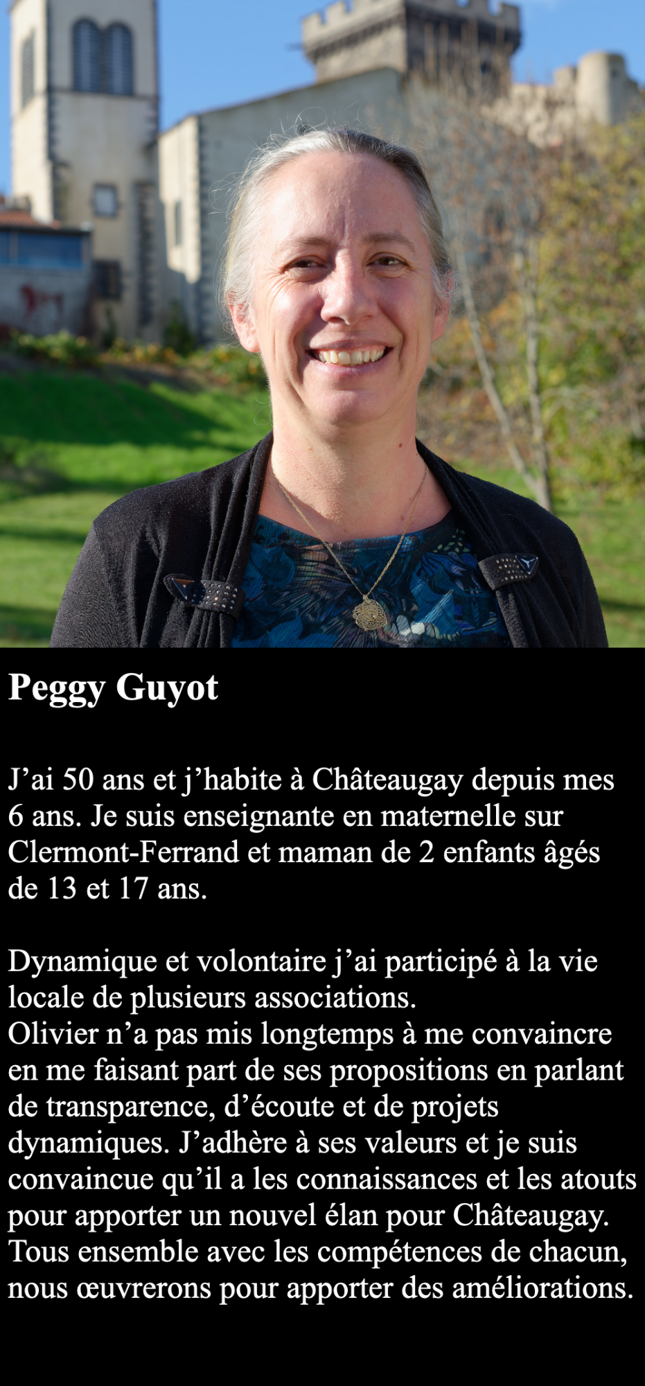 Au-dela du strict respect de la parité, mon équipe se veut être la plus représentative possible de Châteaugay et des ses habitants. Elle couvre les différents quartiers de la commune, les différentes tranches d'âge et les différents types d'activités. Une équipe diversifiée, représentative et compétente pour un seul but : un nouvel élan pour Châteaugay.