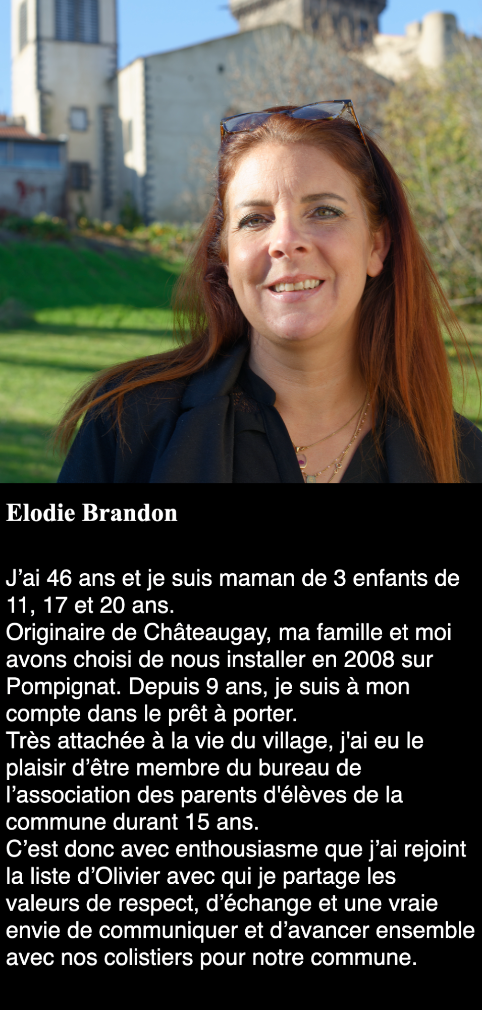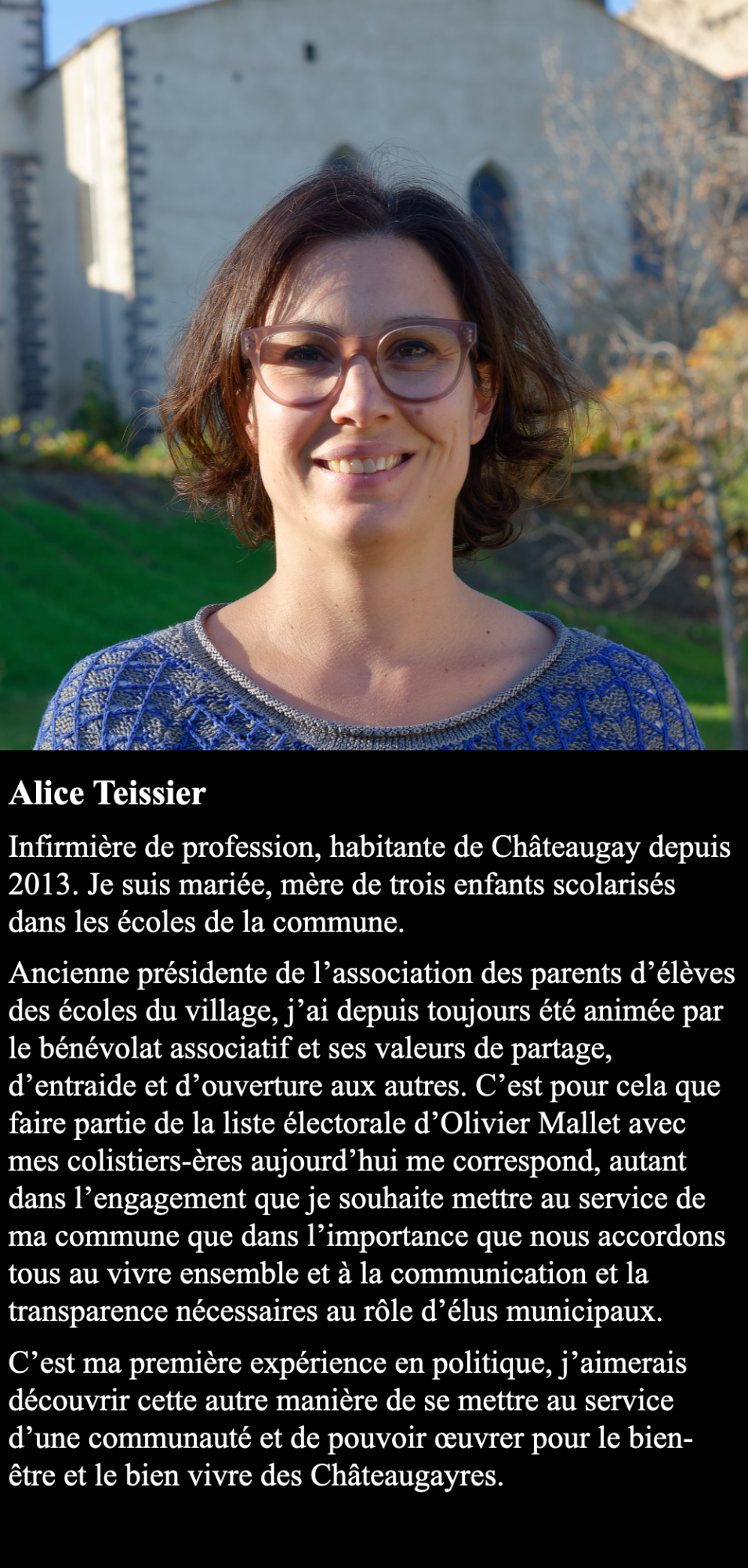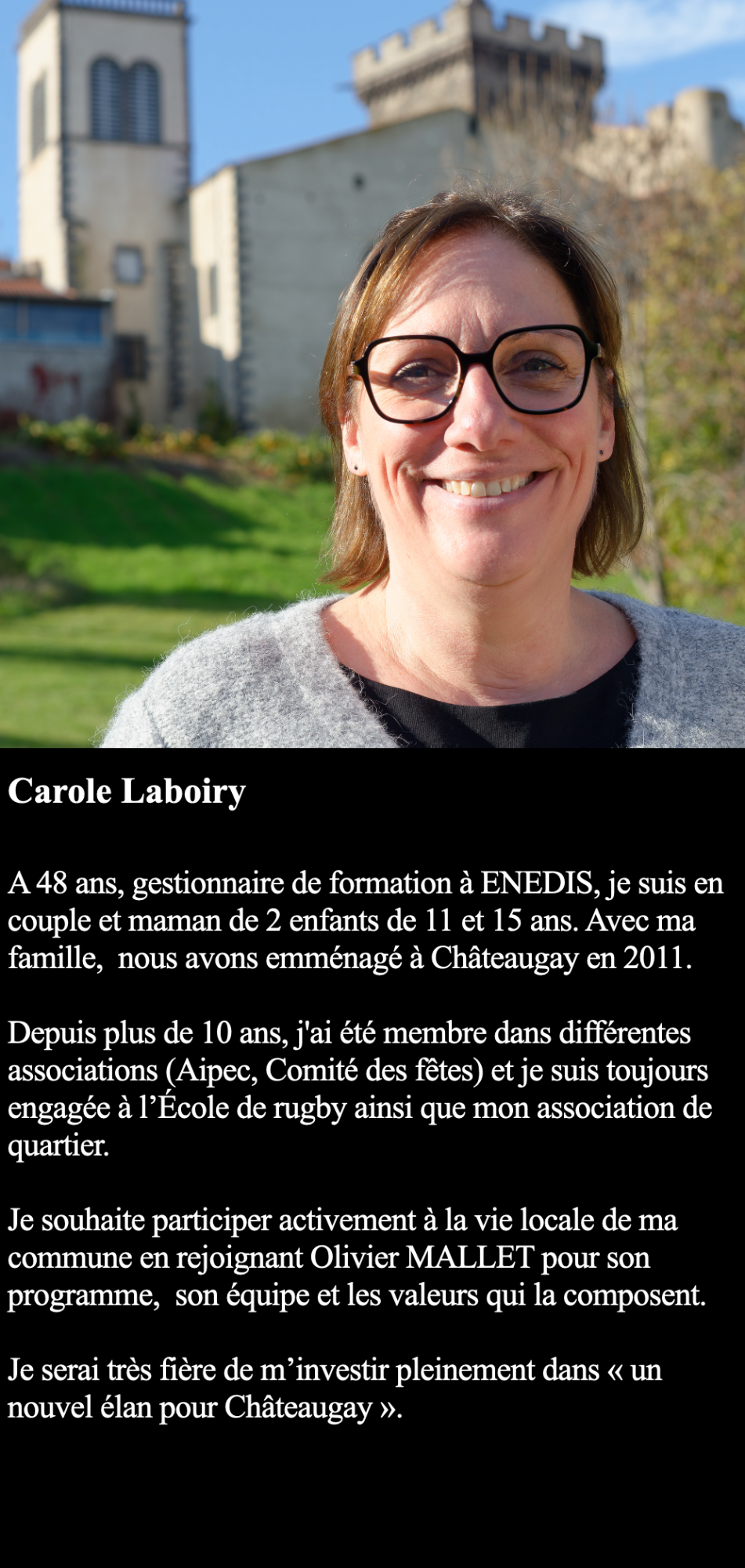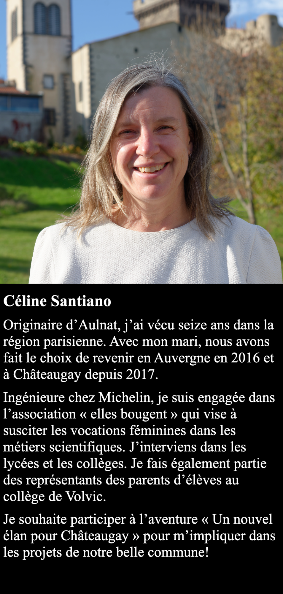 Au-dela du strict respect de la parité, mon équipe se veut être la plus représentative possible de Châteaugay et des ses habitants. Elle couvre les différents quartiers de la commune, les différentes tranches d'âge et les différents types d'activités. Une équipe diversifiée, représentative et compétente pour un seul but : un nouvel élan pour Châteaugay.