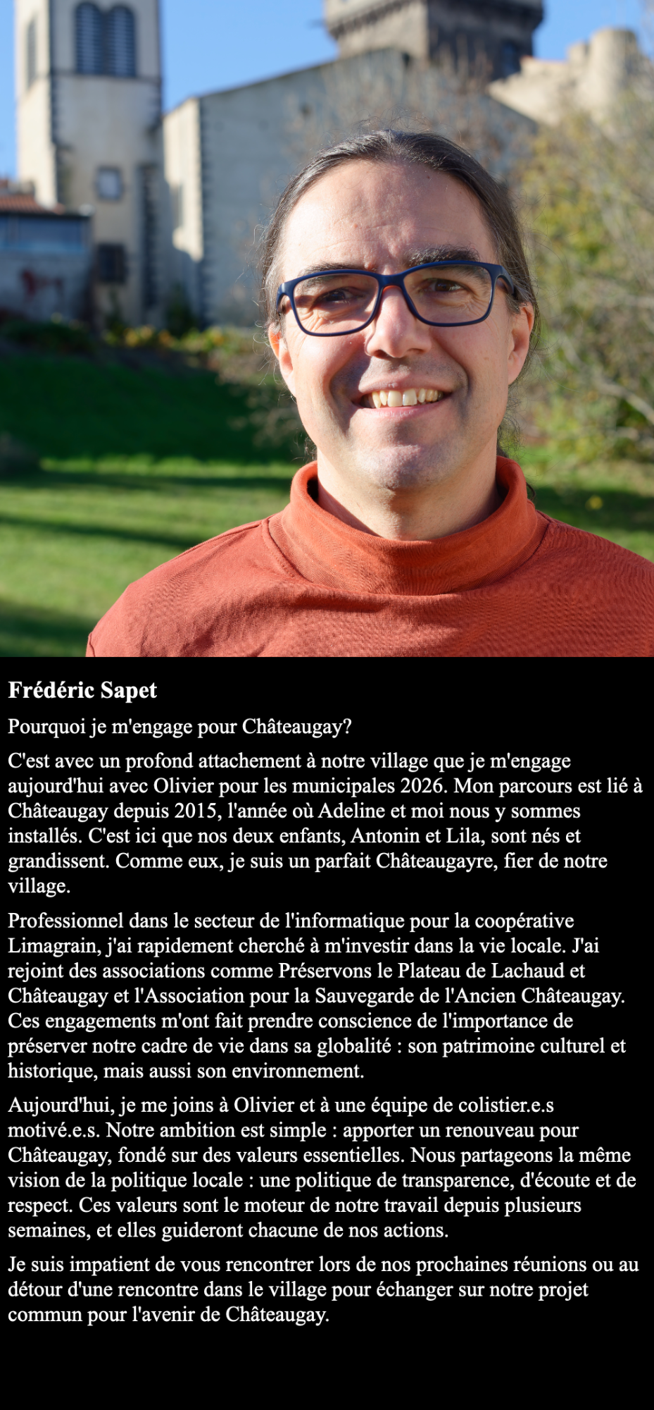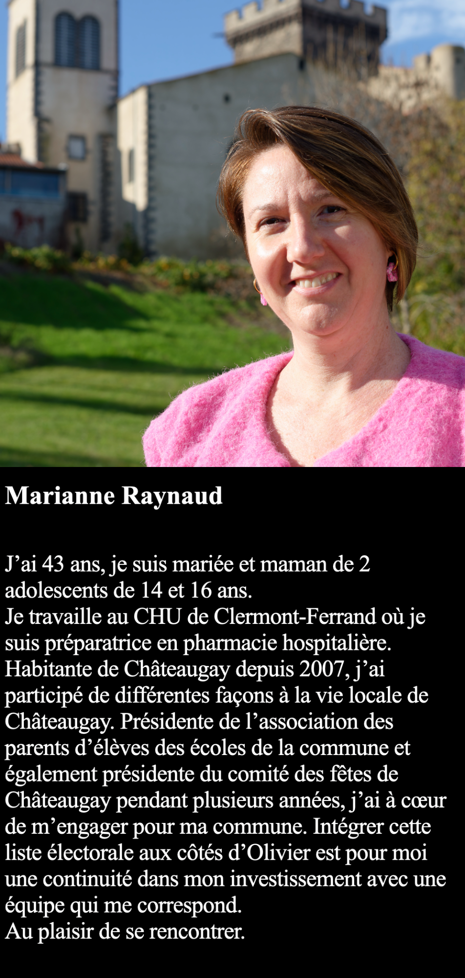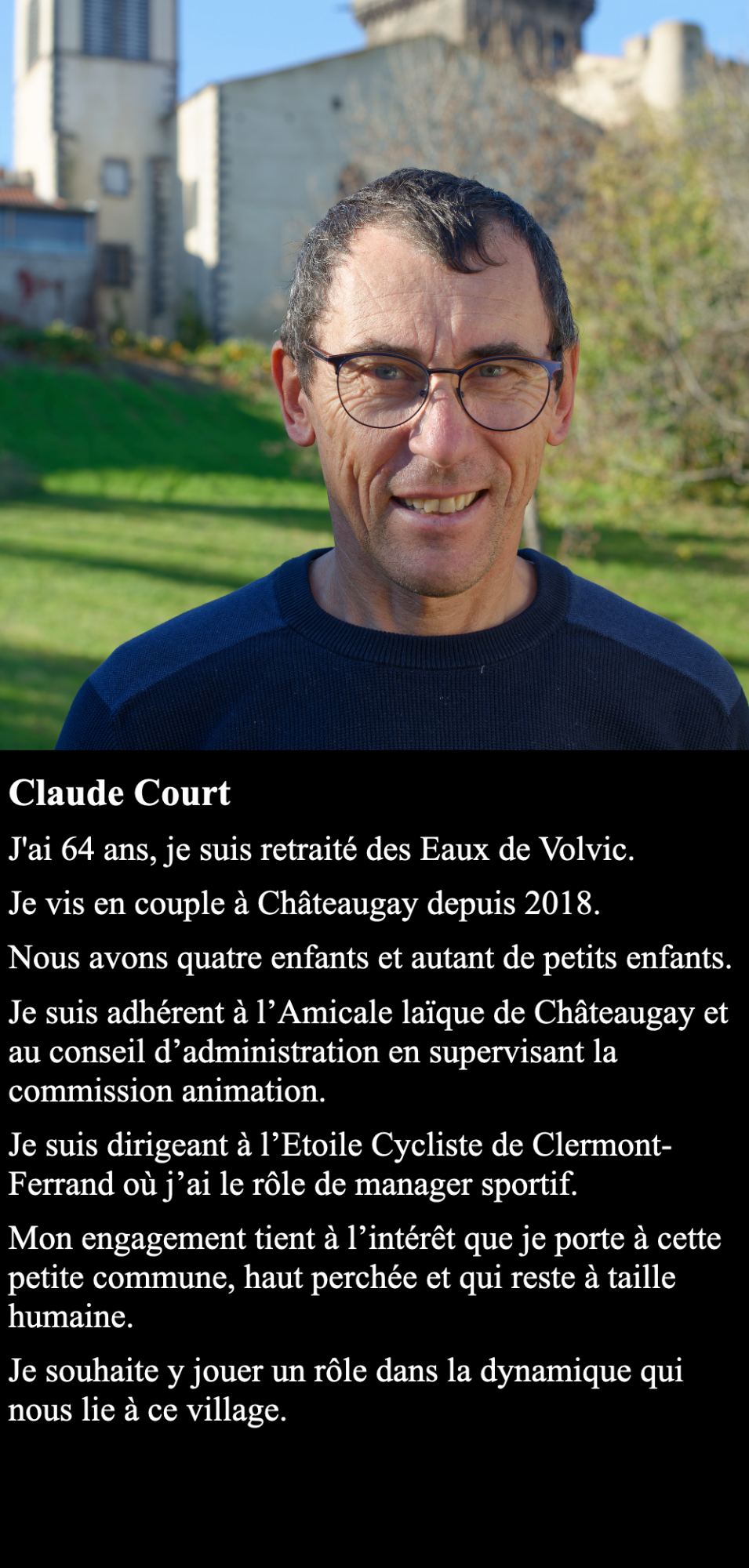 J’habite Châteaugay depuis 17 ans, ma femme est issue d’une famille installée au village depuis plusieurs générations et je suis papa d’un garçon de 11 ans.